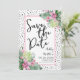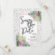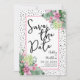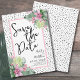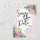 Un diseño tropical que abraza la belleza tranquila de la naturaleza mezclada con un toque juguetón que seguramente te ayudará a divertirte. Una mezcla de calmantes hojas tropicales verdes, incluyendo hojas de plátano, palmas, hojas de monstera y plantas de princesa rosa, junto con flores de orquídea púrpura-rosa y flor de protea, entrelazadas con varios otros follajes. Añadiendo un elemento de diversión, un fondo negro de 'punto desordenado' o 'punto dálmata' infunde el diseño con un toque juguetón. Mejorado por una fuente manuscrita moderna, esta impresión encantadora irradia encanto y sofisticación. Este diseño versátil trae un sentido de paraíso tropical a cualquier entorno u ocasión especial, haciéndolo perfecto para una boda de destino, o simplemente cuando quieres agregar un toque tropical. Floral Colorido Palma Acuarela Tropical Boda Save the Date