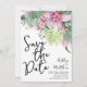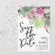 Un diseño tropical que abraza la belleza tranquila de la naturaleza mezclada con un toque juguetón que seguramente te ayudará a divertirte. Una mezcla de calmantes hojas tropicales verdes, incluyendo hojas de plátano, palmas, hojas de monstera y plantas de princesa rosa, junto con flores de orquídea púrpura-rosa y flor de protea, entrelazadas con varios otros follajes. Añadiendo un elemento de diversión, un fondo negro de 'punto desordenado' o 'punto dálmata' en la parte posterior infunde el diseño con un toque juguetón (puedes eliminarlo si lo deseas). Mejorado por una fuente manuscrita moderna, esta impresión encantadora irradia encanto y sofisticación. Este diseño versátil trae un sentido de paraíso tropical a cualquier entorno u ocasión especial, lo que lo hace perfecto para una boda de destino, o simplemente cuando deseas agregar un toque tropical. Floral Moderna Acuarela Tropical Boda Save the Date Chic