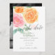 Un encantador y delicado anuncio de bodas de flores para guardar la fecha, con tu foto de compromiso favorita en el reverso. Este diseño presenta grandes rosas en acuarela en naranja y rosa, con hojas verdes, superpuestas con "guardar la fecha" en fuente de caligrafía gris. Personaliza con los detalles de tu boda en fuente gris.