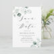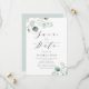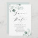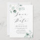 Reserva la fecha! Invitación tu evento con este personalizable Bar Mitzvah ahorra el anuncio de la fecha. Esta invitación a mitzvah de murciélago verde presenta hojas de eucaliptos azules polvorientas con un guion caprichoso. Personalice agregando sus propios detalles. Este bar de eucaliptos Mitzvah ahorra la fecha es perfecto para cualquier temporada y tema.