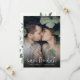 Moda boda moderna Guardar las tarjetas de fecha con un diseño de dos caras con tus fotos y texto. En la parte delantera, agregue la foto completa con una superposición minimalista de texto y letra con letras a mano. En la parte trasera hay espacio para todos los detalles bodas adicionales rodeados por un marco botánico de hojas y ramas de color agua boho. Utilice las herramientas de diseño para editar fuentes y colores de texto o agregue más fotos para diseñar un anuncio único de Guardar la fecha para su boda.