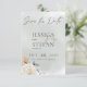 El diseño se caracteriza por sus rosas blancas y rosas negras y por su marco medio de hierba de pampas marrón sobre un suave fondo de color verde agua. Esta tarjeta es parte de la colección Boho Pampas & Pink Roses Boda Suite creada por Simply Farmhouse Press.