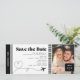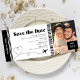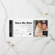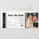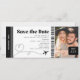 Boleto de boda de embarque moderno con un simple fondo blanco que se puede cambiar a cualquier color, una foto de la pareja comprometida, un avión con un rastro de corazón en bucle, y una plantilla personalizada de save the date que es fácil de personalizar.