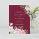 Una elegante boda floral Salve la tarjeta de fecha con flores color agua rosa con caligrafía moderna escrita a mano sobre un fondo rojo burdeos.