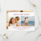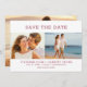 El diseño moderno y fresco muestra tres de tus fotografías. Dos fotos más pequeñas crean una banda a través del centro de la invitación a guardar la fecha. Una foto de tamaño completo cubre toda la parte posterior de la tarjeta de fecha para guardar. El serif de la losa le da a la carta su aspecto moderno y moderno. Todo el texto se puede editar. Plantilla muy fácil de usar.