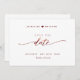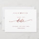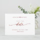 Anuncie su cita con su boda con esta hermosa boda, salve la tarjeta de fecha. Escrito a mano moderna Los detalles del guión en Relieve metalizado burdeos en el frente y en la espalda. Volver con el único sello Guardar la fecha/monograma con nombres de parejas. El estilo es limpio y sencillo. Diseño blanco y burdeos. Área para sitio web boda, más información o/o mensaje para sus invitados (es decir, "¡No puedo esperar para verte ahí!").