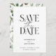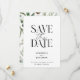 Tarjeta de anuncio de boda de guión de vegetación minimalista moderna no foto guardar la fecha. El eucalipto pintado a mano, el follaje minimalista y la guirnalda rústica moderna dan a esta tarjeta de anuncio un toque lujoso. En verdes, marrones y grises clásicos.