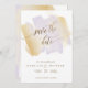 Elegante Boda Salvar la tarjeta Date con hermosos pinceladas en una armoniosa mezcla de tonos morados y dorados amarillos con la frase "Save the Date" en elegante caligrafía escrita a mano moderna. Atractiva espalda con lavado de pinceladas. Estilo minimalista moderno y elegante. Nota: la tipografía no está en Relieve metalizado real, sino más bien impresa en un tono dorado. Parte de nuestra colección "Boda de pinceles morados y dorados" con una variedad de productos de coordinación disponibles.