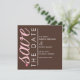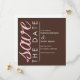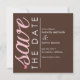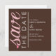 Este adorable anuncio de Save The Date incluye la frase "guardar la fecha" en rosa y blanco a la izquierda de la invitación, y su personalización a la derecha en blanco.