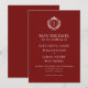 Perfect for both printed and digital Save the Date cards, this customizable design coordinates beautifully with matching invitations, envelopes, and the entire burgundy crest wedding collection.