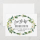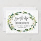 Tarjeta de diseño único y elegante con hermosas rosas blancas a la acuarela, ramo de peonías, caligrafía moderna "avisa de la fecha", sobre fondo blanco. Utilice la herramienta Personalizar para agregar su información, cambiar fuentes, color de fondo. Para artículos coincidentes, visite mi Colección Floral Blanca Floreciendo.