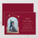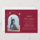 Burgundy Místico Dorado Sol Luna Estrella Espacio Astronomía Cósmica Galaxia Celeste Fechas para Guardar presenta un marco de sol, luna y estrellas doradas sobre un fondo burgundy. Dentro está tu foto favorita y tu información personalizada de fecha para guardar. Personaliza editando el texto en las casillas de texto. Diseñado para ti por ©Evco Studio www.zazzle.com/store/evcostudio