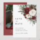 A refined burgundy winter floral photo save the date featuring rich burgundy roses, soft ivory blooms, and elegant greenery with subtle pinecone details, designed for a romantic and timeless winter wedding aesthetic. The warm balance of deep burgundy and natural ivory creates a cozy yet elevated look, perfect for holiday weddings, Christmas celebrations, and rustic elegant venues. This photo save the date design allows you to incorporate your own image, creating a meaningful and personal first impression for your wedding announcement.