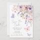 The card features watercolor wildflowers and greenery with fluttering pink and purple butterflies. Names and wedding date appear in a mix of handwritten script and clean serif fonts for a modern yet timeless look.