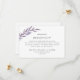 Haga una declaración de elegancia sobria con esta sencilla y clásica tarjeta de gabinete de boda basada en texto acentuada por una simple rama lila púrpura. Utilice la opción de personalización para cambiar colores y tipos de letra que se adapten a su tema boda. Personaliza todo el texto de esta tarjeta de inserción de recepción y ayuda a dirigir a tu invitado a la siguiente ubicación.