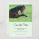 Guarda la tarjeta de dátil con una hermosa fotografía que muestra un hermoso caballo marrón tendido en el césped, con un aspecto tranquilo y contento.