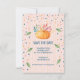 Cena de Acción de Gracias, u otro evento, guardar la tarjeta plana de fecha. Diseñado con un fondo rayado en rosa y oro. Una calabaza acuática naranja con hojas de colores. Falsos confeti festivos en rosa, azul y naranja con hojas verdes cayendo alrededor de los bordes de la carta.