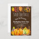 Guarda la tarjeta de fiesta de festividad de agradecimiento. Diseñado con un ilustracion acuático de calabazas, bellotas, setas y hojas de otoño de temporada. Un borde a lo largo de la parte superior también compuesto de hojas de otoño, bayas, bellotas y otros follajes. Fondo acuático marrón oscuro.