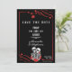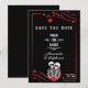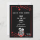 Anuncia tu boda gótica con estilo con esta pareja de calaveras personalizadas para la fecha de la boda con rosas rojas y vibras dramáticas de romance oscuro.