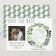 Haga saber a amigos y familiares que se van a casar con estas sencillas tarjetas de anuncio de fecha de boda de aquarela. El diseño presenta tipografía rústica y una guirnalda de follaje verde pintada a mano con aquarela. Una adorable foto de la feliz pareja añade un toque especial, al igual que el calendario personalizado. Perfecto para una boda de primavera o verano.