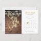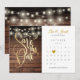 Esta elegante tarjeta de "save the date" rústica presenta un elegante texto de "save the date" en guión dorado sobre paneles de madera rústicos y luces de fondo de cuerda, además de un calendario y un precioso corazón de amor dorado que destaca su fecha especial. Diseñado por Thisisnotme©