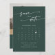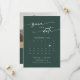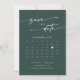 Este calendario de fotos de código QR verde esmeralda de moda boho ahorra la tarjeta de fecha es perfecta para un boda minimalista. El bosque de cazadores negros y húmedos de diseño bohemio moderno presenta una caligrafía rústica sencilla con un estilo único y clásico. Personalice su fecha de guardar con el calendario del mes de su boda con un corazón sobre la fecha de su boda, sus nombres, ubicación del boda, una foto de compromiso y un código QR que enlaza a su sitio web de bodas.