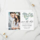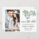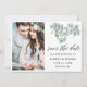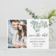 Guión moderno de caligrafía, elegantes hojas de eucalipto botánico de color de agua, verde para guardar la tarjeta de foto de la pareja de Invitación de compromiso de fecha