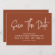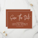La caligrafía moderna ahorra la fecha en un tono terracota sano con un código QR escaneado digital para un sitio web o información de contacto en la parte posterior.