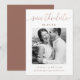 Esta moderna Wedding Save the Date presenta una hermosa caligrafía en color cobre y una foto con una sólida espalda color marrón de terracota.