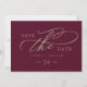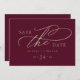 Este romántico código QR de caligrafía burdeos horizontal ahorra la tarjeta de fecha es perfecta para un simple boda. El moderno diseño clásico presenta vistosos remolinos y florituras con magnífica y elegante tipografía de oro con imitación de champagne a mano. Nota: Este diseño no tiene Relieve metalizado oro real. Es un gráfico de alta calidad hecho para parecer un Relieve metalizado dorado.