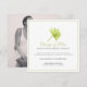Una simple tarjeta de cambio de planes de boda con una hoja de palma de arte de acuarela, texto negro y verde, y en un blanco con una foto en el reverso. Permita que sus invitados sepan que su boda u otro evento ha sido cancelado o pospuesto debido a circunstancias imprevistas. Otros artículos coincidentes están disponibles. Arte y diseño simple de hoja tropical de acuarela por Sarah Trett para www.mylittleeden.com
