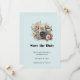 Save the date card with a vintage styled camera decorated with flowers. Pastel colors of pink, cream and green.