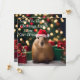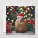 Esta imagen captura la escena acogedora de las fiestas con el carpincho con un sombrero de Santa, rodeado de regalos y un fondo soñador con efecto bokeh.