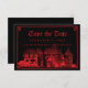 Impresiona a tus invitados con este aviso de guardar la fecha de boda gótica. Esta tarjeta clásica presenta una inquietante ilustración vintage de un castillo, que puedes reemplazar con una imagen del destino donde te casarás (se prefiere fondo transparente). Una tipografía blackletter caligráfica muestra los nombres de la novia y el novio, la fecha y la ubicación. Un borde dibujado a mano encierra el diseño. La paleta de colores es rojo sangre sobre negro.