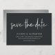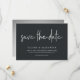 Una tarjeta de fecha moderna para guardar la tarjeta diseñada para parejas de lujo o bodas de la ciudad. "Guardar la fecha" aparece en letras manuscritas falsas de Relieve metalizado de plata. Personalice con sus nombres, fecha de boda y ubicación boda debajo de las letras blancas en un suave fondo negro.
