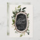 Una pizarra rústica boda con tiza y una ducha de novia con trozos de madera invitan a relajarse. Con una hermosa follaje acuarela, flores blancas, trozos de madera y escritura a mano. Esta moderna invitación a los fiestas le asegurará el estilo de su próxima boda.
