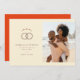 This Save the Date card features a split layout with a soft beige background, combining digital illustration and photography for a modern yet elegant look. The left side showcases interlocking rings adorned with heart shapes, while the right side includes a joyful beach photo placeholder. Serif typography adds sophistication to the customizable text fields, ensuring clarity and style. The overall mood is cheerful and romantic, perfect for announcing a wedding in a warm, inviting way.