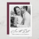 Tarjeta elegante de caligrafía y foto trasera de burgundy para guardar la fecha de la boda.