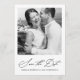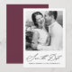 Tarjeta elegante de guardar la fecha de la boda con caligrafía y foto de fondo burgundy.