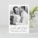 Caligrafía elegante y parte trasera de la tarjeta de foto azul oscuro para guardar la fecha de la boda.