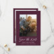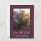 Elegante boda ahorra la tarjeta de fecha con un diseño simple y mínimo con "Save the Date" en una tipografía moderna junto con los detalles de tu evento debajo de tu foto vertical favorita. La parte posterior tiene una segunda imagen junto con una línea opcional de texto sobre la parte inferior de la imagen. El tema del color es morera / vino y puede cambiarse en la herramienta de edición de diseño. Este diseño es genial, ya sea que tengas un boda formal o informal.