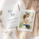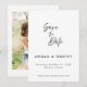 Un simple clásico anuncio de boda con foto en negro y blanco para guardar la fecha.. Esta tarjeta de guardar la fecha presenta un elegante texto con un tema simple en negro y blanco y una foto en el reverso. Personalice el texto con todos los detalles para su día especial.
