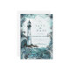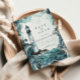 This coastal wedding design features a hand-illustrated lighthouse rising above dramatic ocean waves, framed by flowing watercolor textures in soft teal, seafoam, and deep blue tones. The composition blends nautical romance with an elegant, storybook feel, creating a striking yet refined seaside aesthetic.