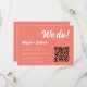 Código QR moderno Coral Pink '¡Nos casamos!' Boda Guardar la fecha. Agregue la fecha de su boda futura, ubicación y la información del sitio web de la boda, así como los nombres de la novia y el novio en elegante letra script. Por favor, envíe un mensaje al diseñador si necesita ayuda para hacer cambios.