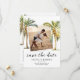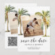 ¡Tarjetas de aviso de destino de verano! Creado con un simple fondo blanco, 2 fotos de la novia/novio, palmeras tropicales de acuarela, un código QR (reemplaza esto con el tuyo), y una plantilla elegante fácil de personalizar.