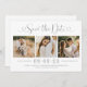 Las bodas modernas en blanco y gris plateado ahorran la invitación de fecha con un collage de tres fotos cuadradas de compromiso y un diseño tipográfico elegante con guión de caligrafía de moda y acentos cardíacos. El texto personalizado simple y elegante que puede ser completamente personalizado con la fecha numérica del boda, los nombres de novias y novios, la ubicación de la ceremonia, el sitio web del boda y la invitación formal para seguir la redacción.