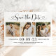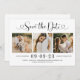 Las bodas modernas en blanco y negro, salvo las tarjetas de invitación de fecha, presentan un collage de tres fotos de compromiso cuadradas y un diseño elegante de tipografía negra con guión de caligrafía de moda y acentos cardíacos. El texto personalizado simple y elegante que puede ser completamente personalizado con la fecha numérica del boda, los nombres de novias y novios, la ubicación de la ceremonia, el sitio web del boda y la invitación formal para seguir la redacción.