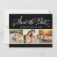 Estilo de personalizado vintage blanco y negro (nota, se puede modificar el color de fondo negro) boda guardar la característica de tarjetas de fecha "Guardar la fecha" en un elegante estilo de escritura caligráfica manuscrita, tres (3) espacios para fotos de compromiso (consejo: recorte a cuadrado antes de la carga) y texto en la parte posterior que se puede personalizar con información del boda.