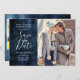Elegante y moderna tarjeta para guardar la fecha de su boda azul marino. El fondo está hecho con hermosa acuarela. Puede agregar sus propias fotos de compromiso. Agregue la fecha de su boda, ciudad y estado, sitio web, etc. Esta tarjeta es de 2 caras y en el reverso puede agregar dos imágenes adicionales (cuadradas) y su sitio web de boda en la parte inferior. Los textos se pueden personalizar fácilmente en línea.