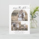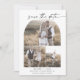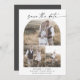 Este moderno collage de fotos en arco boho ahorra la tarjeta de fecha es perfecto para un simple boda. El diseño bohemio en blanco y negro presenta una tipografía industrial única con un estilo vintage minimalista. Personalice la parte delantera de la tarjeta con 3 fotos, sus nombres, fecha y ubicación del boda.